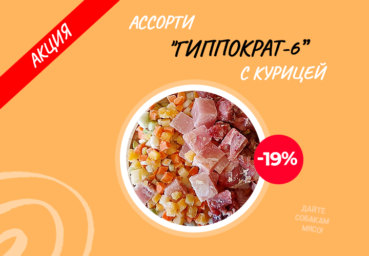 Друзья, Ассорти "Гиппократ-6" с курицей прямо сейчас доступно по хорошей цене! (СКИДКА 19%) Белковый компонент: куриное мясо является хорошим источником белка, необходимого для роста мышц и поддержания общего здоровья животных. Курица также богата витаминами группы B, железом и цинком. А также витамины и минералы: овощи, такие как тыква и морковь, добавляют витамины A, C и клетчатку, способствующую пищеварению.
